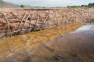 In 2013, McCormick and O’Brien began working with The Nature Conservancy to create works along both the Carson and Truckee rivers. Part erosion control, part habitat development, the 360-foot-long woven structure built in spring 2014 at the River Fork Ranch Preserve in the Carson Valley is their longest structure to-date. Beginning in summer 2014 the pair drew up sketches for the work to be implemented along the Truckee River at the McCarran Ranch Site just east of Reno. This exhibition draws upon archives donated by the artists from their previous works, as well as these two local projects.