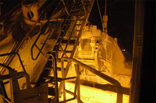 China Town is a video made by artist Lucy Raven as she followed the path of copper ore from an open pit mine in eastern Nevada to China, where it was eventually processed into copper wire. The ore was first taken on trucks to Wendover, a city on the Nevada-Utah border and then sent on railroad cars to Vancouver, Canada. Next it was shipped to Nanjing, China, and finally transported to a plant in China’s interior where it was smelted, refined, and extruded into copper wire. During Raven’s journey she took more than 60,000 digital photographs, which she then narrowed to 7,000 and edited into an animated sequence that comprises the video. Raven also recorded ambient sounds along the way, which became the soundtrack for the film.