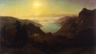 The Sierra Nevada range was a physical and symbolic obstacle to America’s western expansion in the nineteenth century. The legendary struggles of the Donner Party in the winter of 1847, along with an enterprising drive to surmount the summit via railroad, fueled a young nation’s “Manifest Destiny” to stretch its boundary from coast to coast. Artists depicted Donner Lake, the closest body of water to Donner Summit, more frequently than any other in the Sierra range. Unlike the flat, picturesque expanse of Lake Tahoe’s surface, the view of Donner Lake from the summit offered a dramatic, sublime vista layered with historical and symbolic significance.