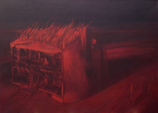 This series of eight, large-scale paintings by Robert Beckmann reveals the potential effects of a nuclear detonation on an American-built, single-family home. The series is based on real-life, Cold War-era testing undertaken on the Nevada Test Site (now the Nevada National Security Site). The deep-red images are based on footage from a 1953 documentary film about the detonation of a 16-kiloton nuclear bomb nicknamed “Annie.” The artist remembers watching the film as a young boy growing up during the Cold War era.