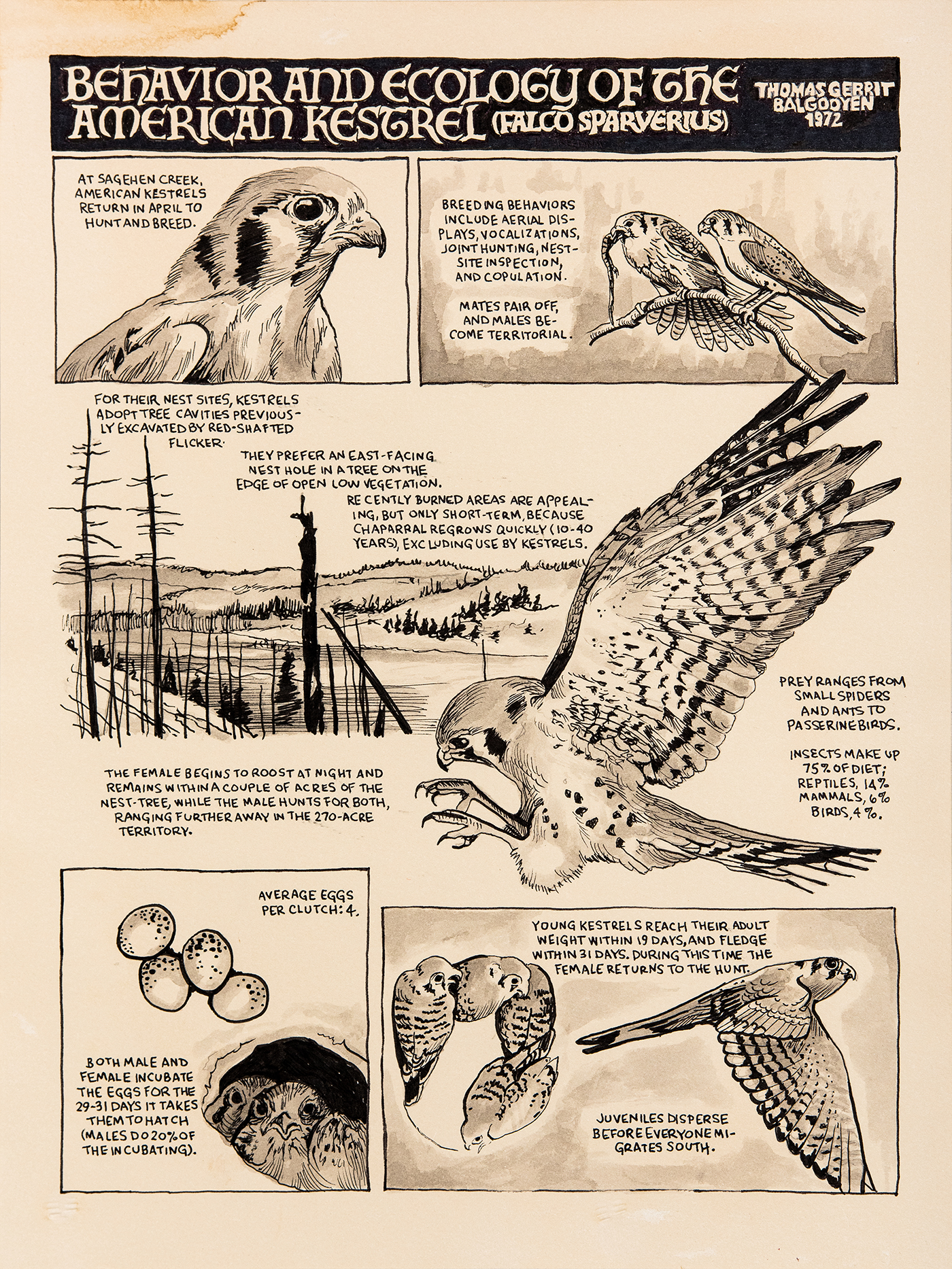 One page comic, "Behavior and Ecology of the American Kestrel (Falco Sparverius), Thomas Gerrit Balgooyen, 1972," created by Christopher Baldwin and Cedra Wood. This comic summarizes a scientific paper of the same name researched at the Sagehen Creek Field Station. |