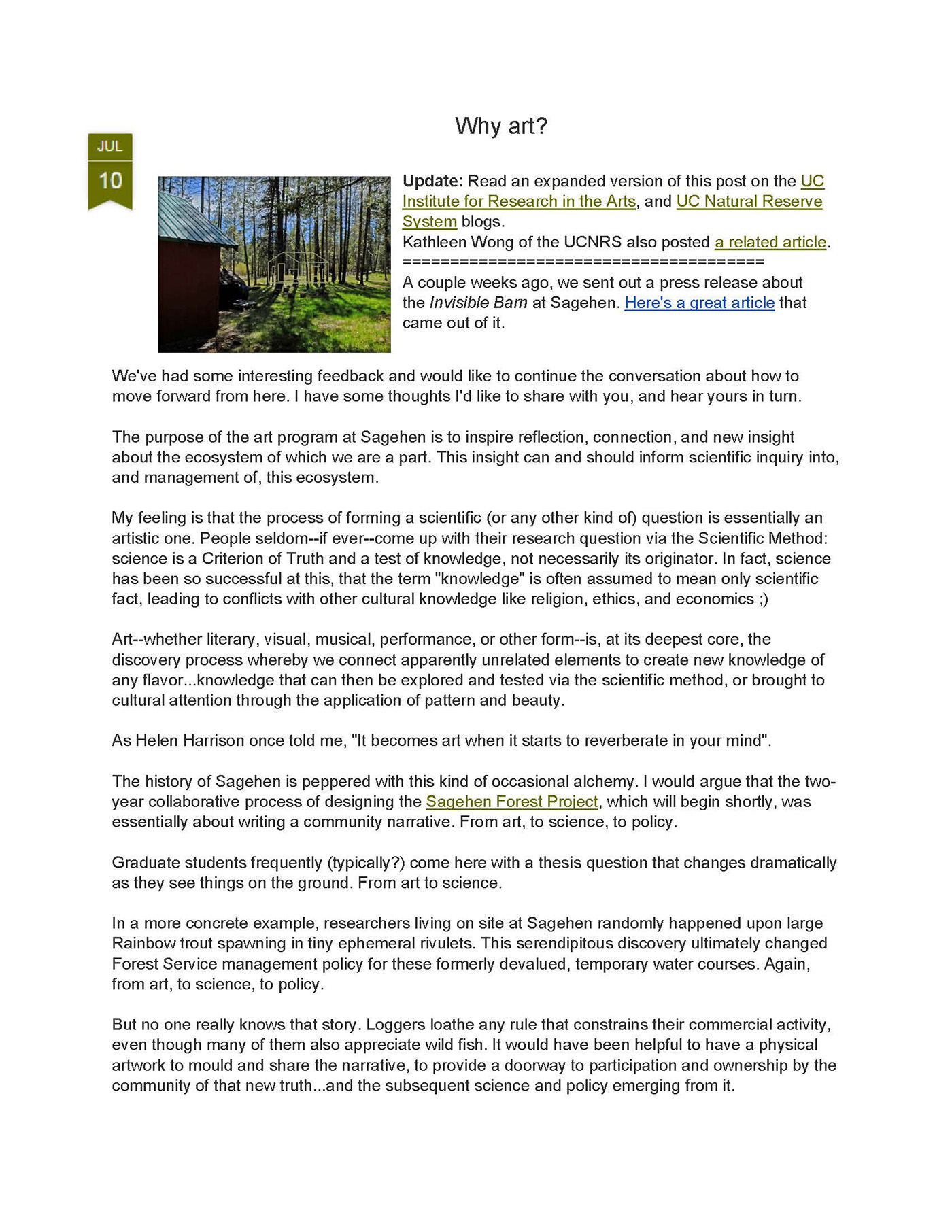 | SUMMARY NOTE | Two page printout of blog by Faerthen Felix on blogspot.com: "Why art?" posted on July 10, 2014. The post describes efforts to create an art program at the Sagehen Creek Field Station and the importance of such a program to researchers and community members alike. |