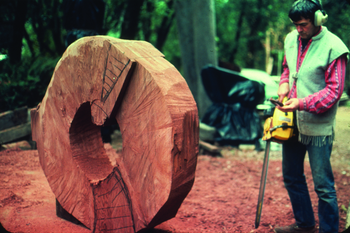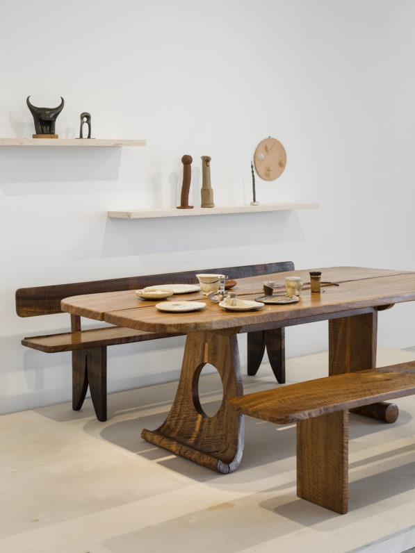 Pairing Allen’s work with that of J.B. Blunk (1926–2002), the Northern Californian artist and designer who seems an obvious precursor and inspiration to the younger sculptor, establishes a dialogue between two sympathetic voices. Blunk began making work in 1962—mainly furniture and sculpture in redwood and cypress, some of which is monumental in scale. He also worked in clay, stone, and cast bronze, and like Allen, his work blurs the line between furniture, functional objects, and sculpture. Blunk’s work is also organic in nature but has a rougher, more rustic quality since his tool of choice was a chainsaw and he wasn’t interested in polishing his pieces, preferring a more natural aesthetic. Both men designed and built their own homes as well as many of the furnishings and objects in them.