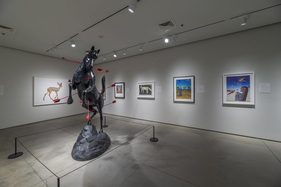 As the world grapples with a pandemic resulting from a novel animal-human virus transmission, some people have chosen to cope with coronavirus-induced isolation by escaping virtually—for example, through video games. This exhibition’s title is inspired by a popular new video game, Animal Crossing: New Horizons, released by Nintendo in March 2020, that invites players to interact with cute animal characters in a completely imaginary world. The artworks on view remind us that artists have always sought a deeper understanding of human interactions with animals.