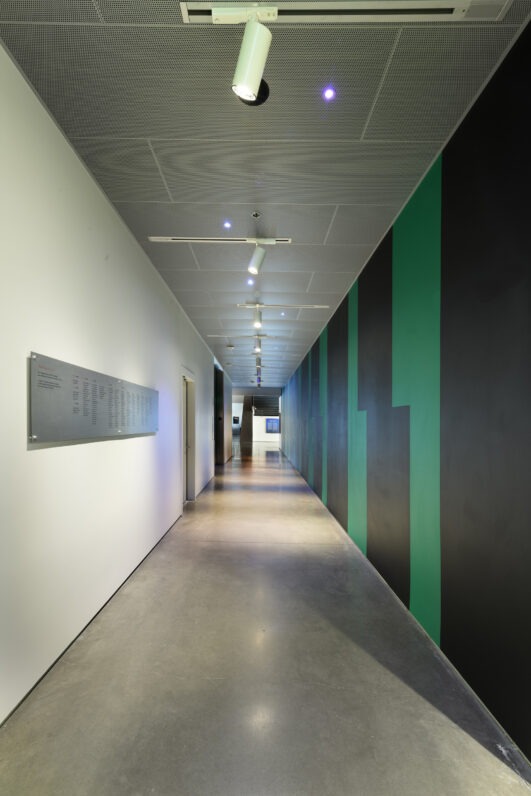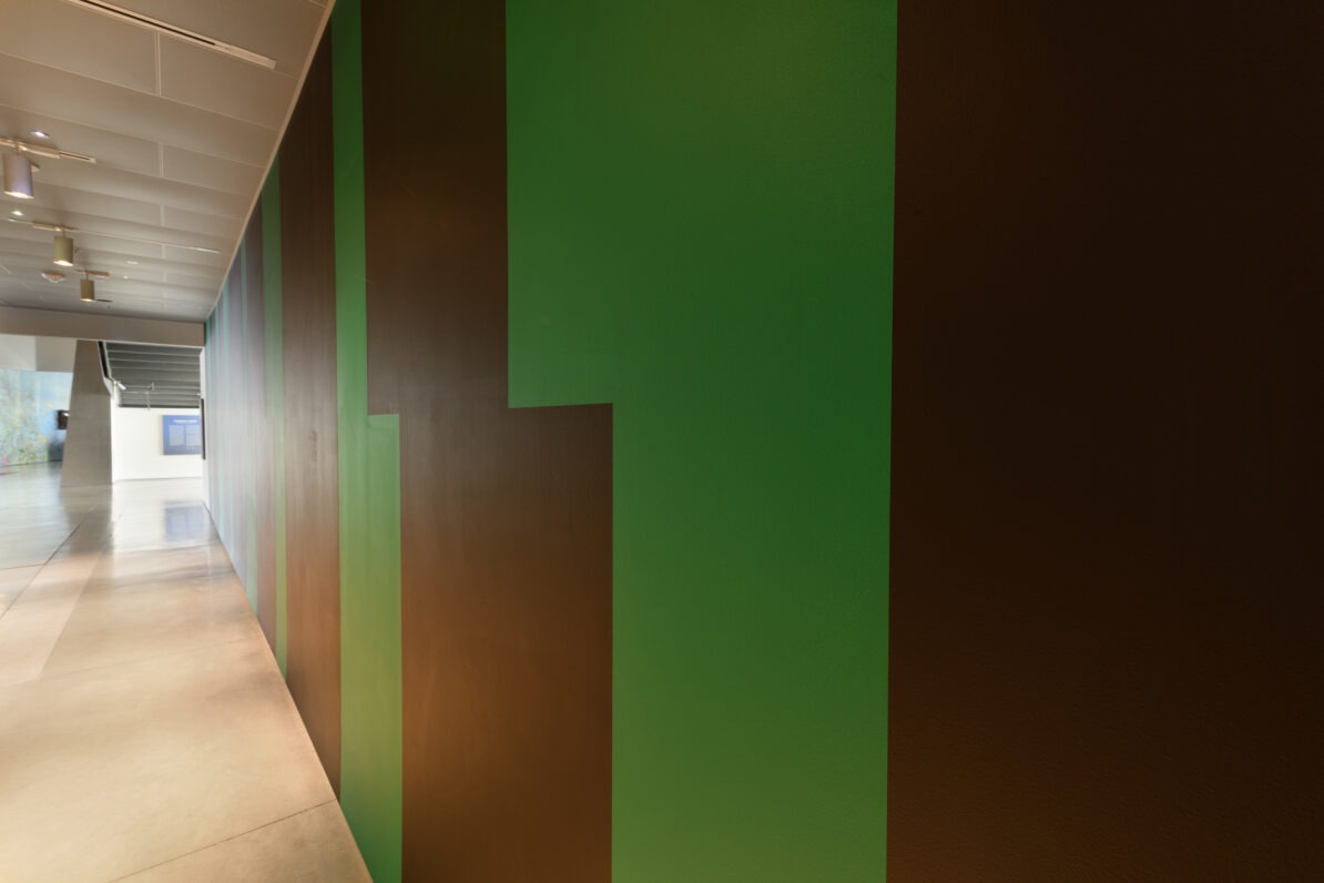 Carmen Herrera painted for over seven decades, receiving recognition for her elegant, hard-edge style late in life. Having developed her signature style in the late 1940s, her work connects to artists such as Piet Mondrian, Ellsworth Kelly, as well as the Neo-concrete work of artists like Lygia Clark and Hélio Oiticica, who flourished in Brazil after World War II. She made large-scale paintings, drawings, sculpture, and much later in life, began making murals modeled after her paintings, many of which have never been executed. Based on her painting La Fonteyn (2015), Untitled (2021) is realized here for the first time.