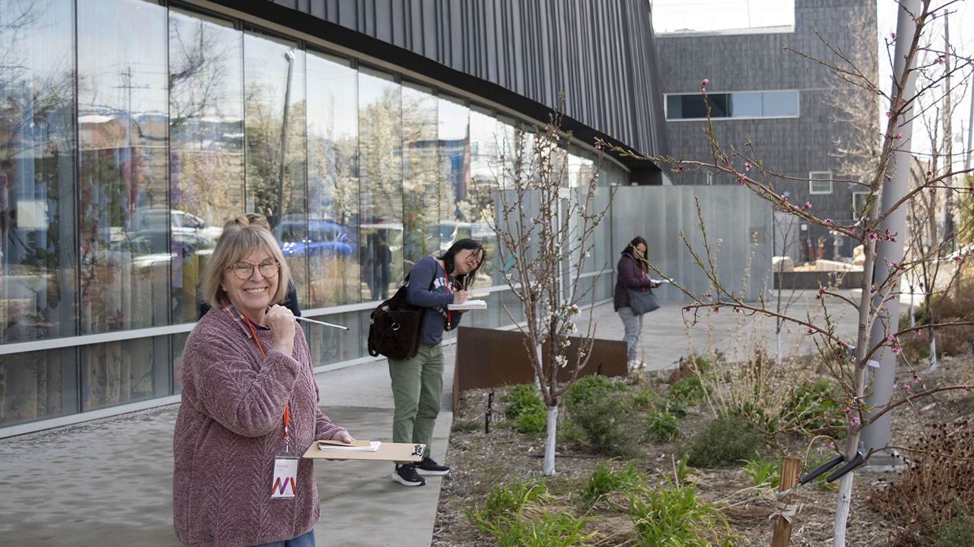The Los Angeles-based artistic duo Fallen Fruit (David Allen Burns and Austin Young) conceived of Monument to Sharing as an immersive art installation in the form of a fruit garden. The living artwork, which occupies the Linda and Alvaro Pascotto Sculpture Plaza outside the Nevada Museum of Art, consists of twenty-four fruit-bearing trees, a berry patch, grapevines, herbs, and a series of edible pollinators that the public is welcome to harvest. Fallen Fruit’s collaborative project invites visitors to explore ideas of generosity, agricultural production, and how gardens can foster civic participation.
