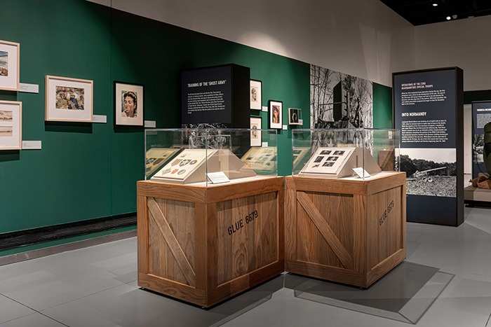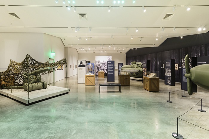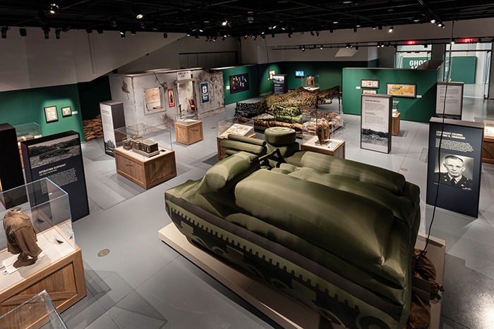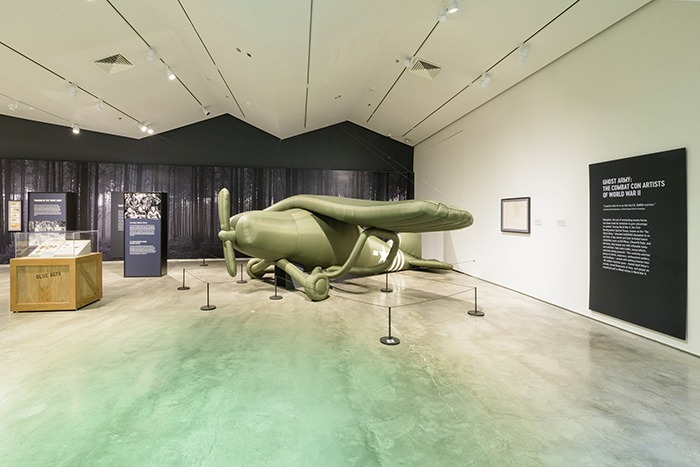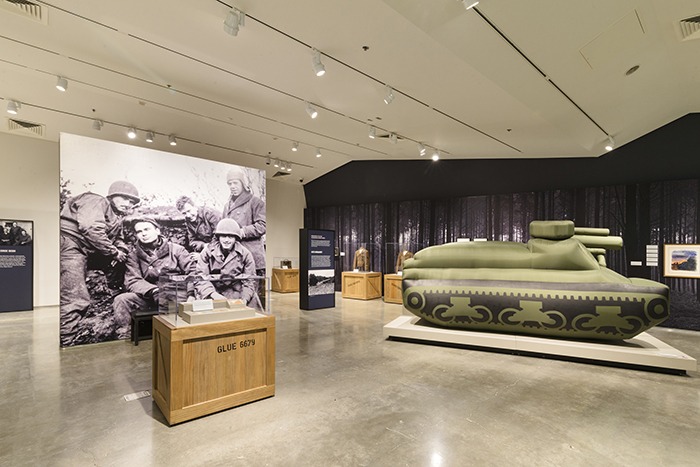 Produced by the National World War II Museum in New Orleans, this exhibition brings together archival photography, historical artifacts, uniforms, sketches, and life-sized recreations of inflatable military equipment used during combat.