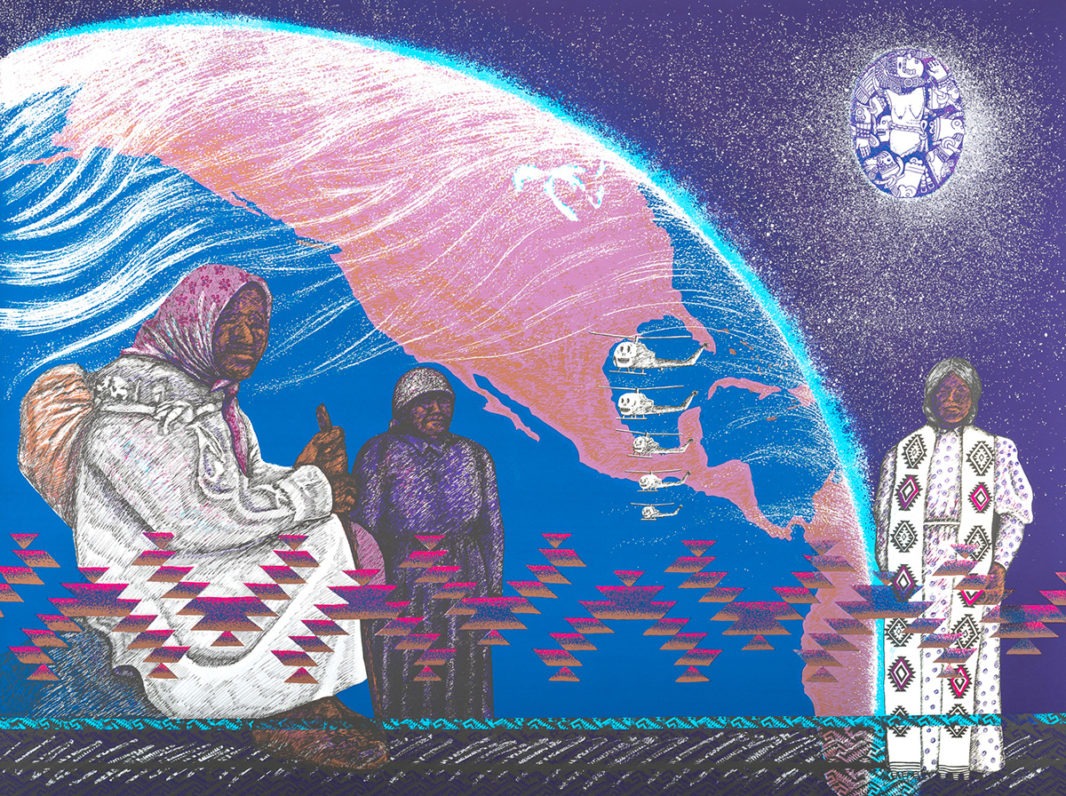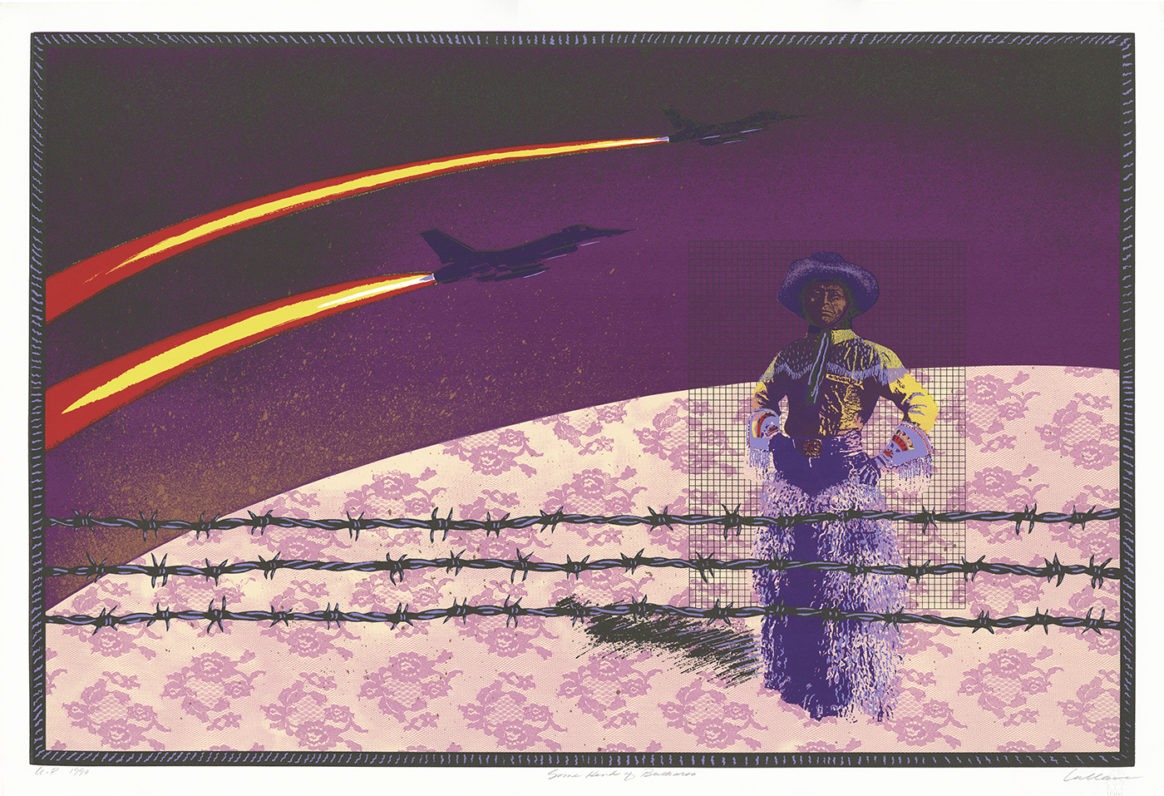 Jean LaMarr (born 1945) makes art that addresses issues such as cultural stereotypes, representations of women and Native American people, and the traditions of her ancestors. Although she has worked primarily as a printmaker, she is also known for her paintings, assemblages, videos, and installation work. LaMarr is of Paiute/Pit River ancestry with family ties to Northern Nevada and northern California, and was born in Susanville, California, in 1945. Her artistic development was critically influenced by the time she spent at UC Berkeley from 1973-76 where she earned her BFA and was involved with activist politics. LaMarr describes herself as a community artist-activist. She lives on the Susanville Indian Rancheria in northeastern California, where she continues to operate the Native American Graphic Workshop.