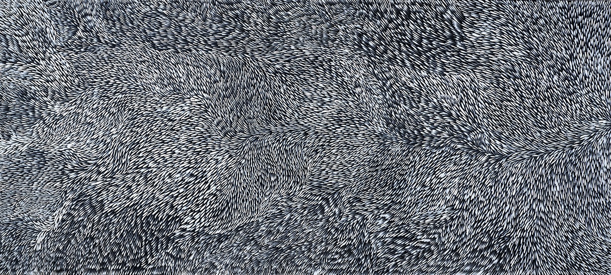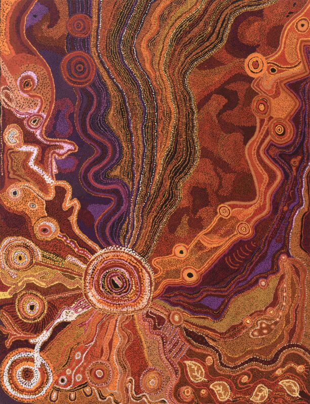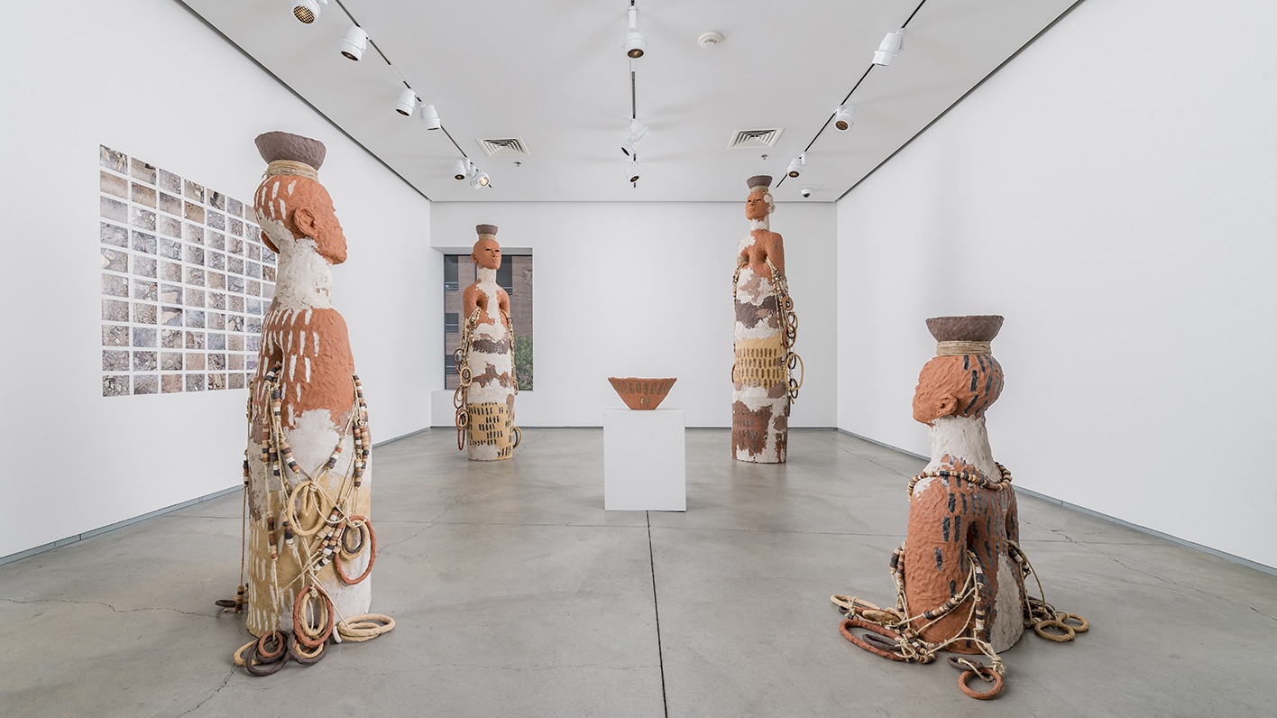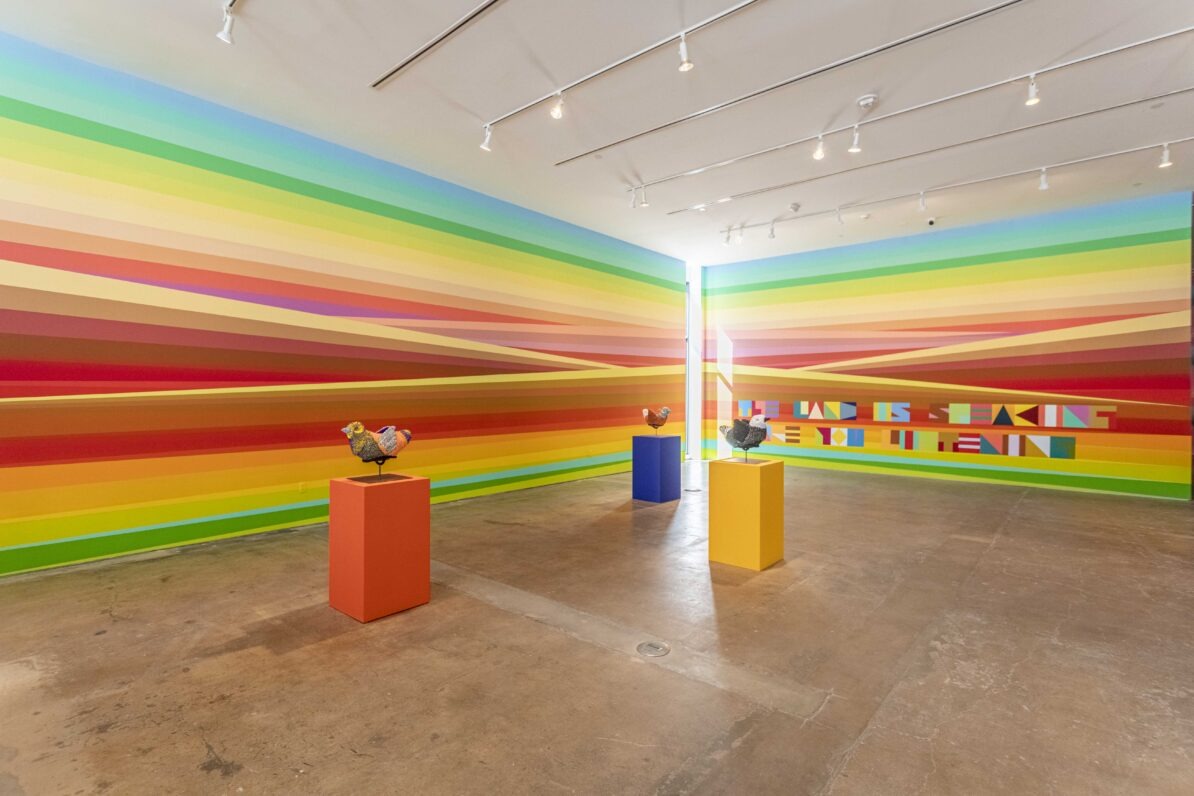 This section of the exhibition grounds the project and serves as the conceptual heart around which the other areas radiate. The myriad artworks on display underscore Indigenous ecological knowledge of diverse types, which have modeled care, respect, and protection of the land for millennia. Indeed, the understanding that life forms belong to and coexist with the natural world is a foundational aspect of Indigenous thought and precedes concepts of ecofeminism, environmentalism, and sustainability. Listening to and extending Indigenous ecological practice and experience is vital for the future well-being of life on Earth. As artist Rose B. Simpson has stated, “We are on a precipice right now, and everything we do will impact the land.” The exhibition endeavors to inspire audiences to envision that edge and carefully navigate away from it. Jeffrey Gibson’s mural The Land Is Speaking, Are You Listening? inspires the title of this section, which features over fifty First Nations artists from Australia, the United States, Canada, and South America.