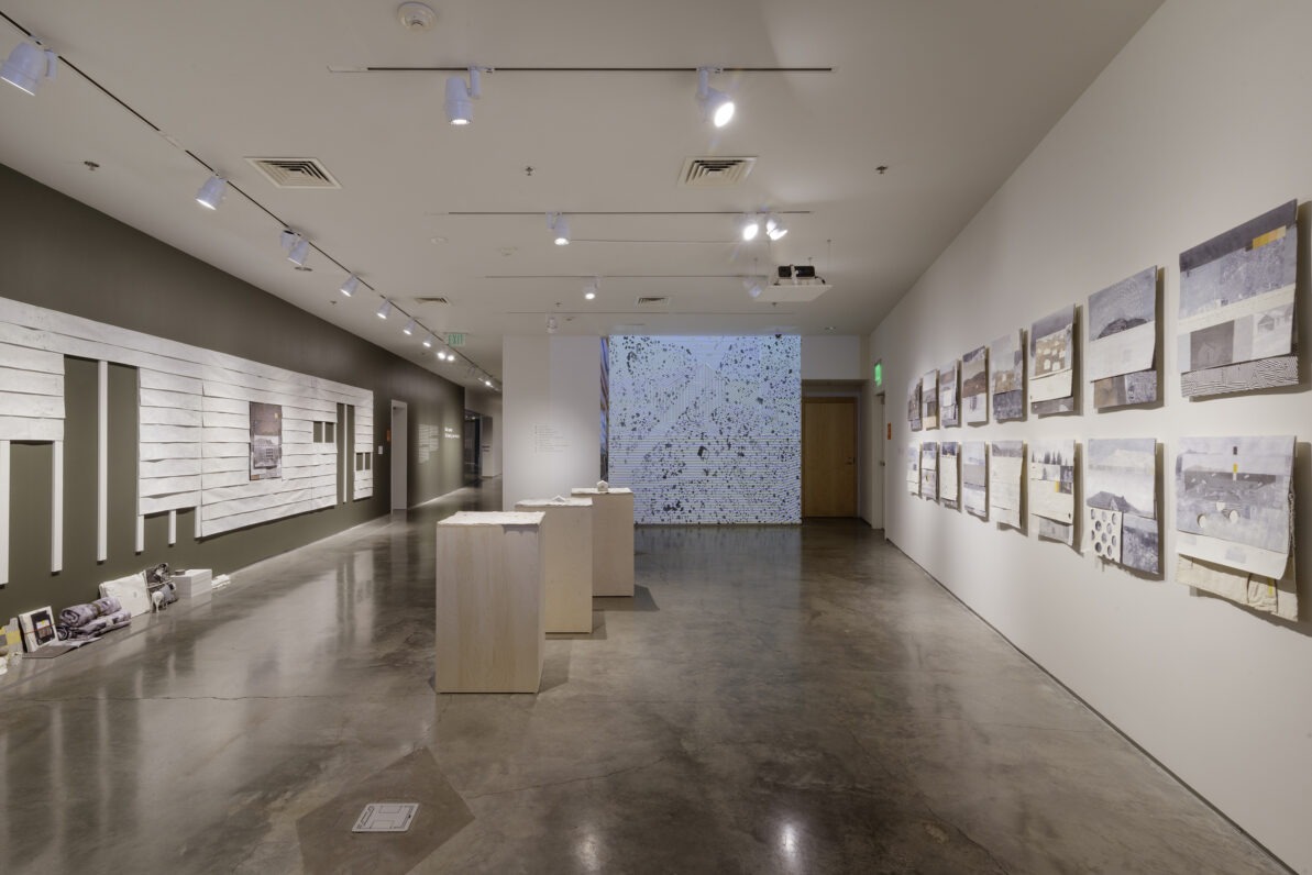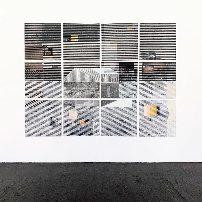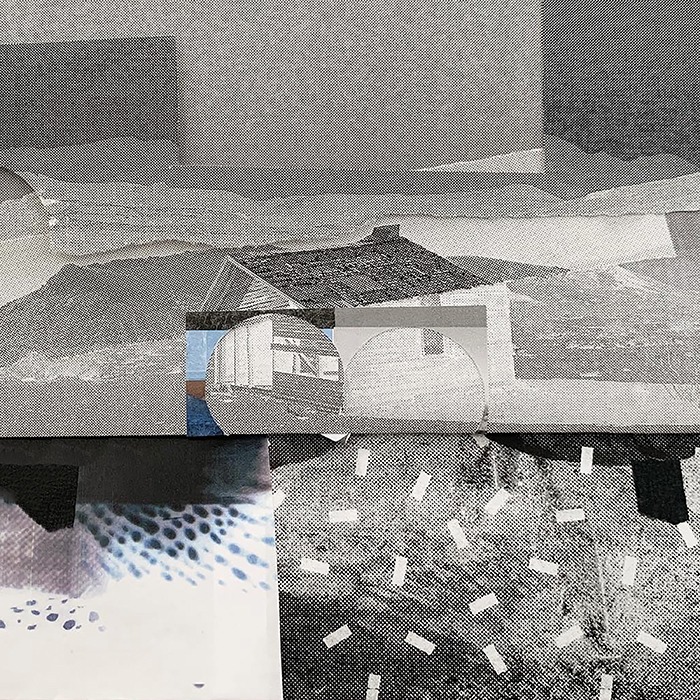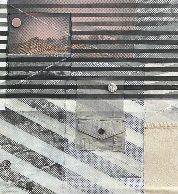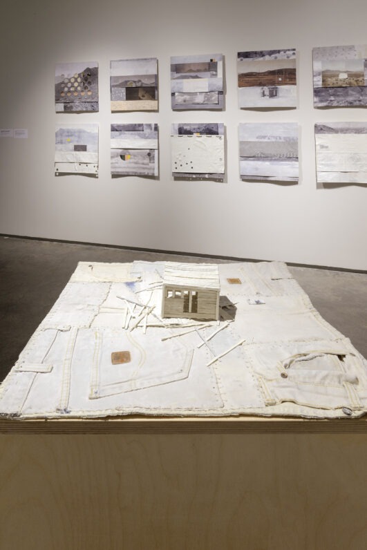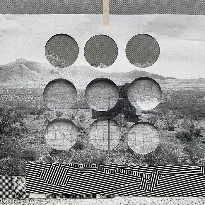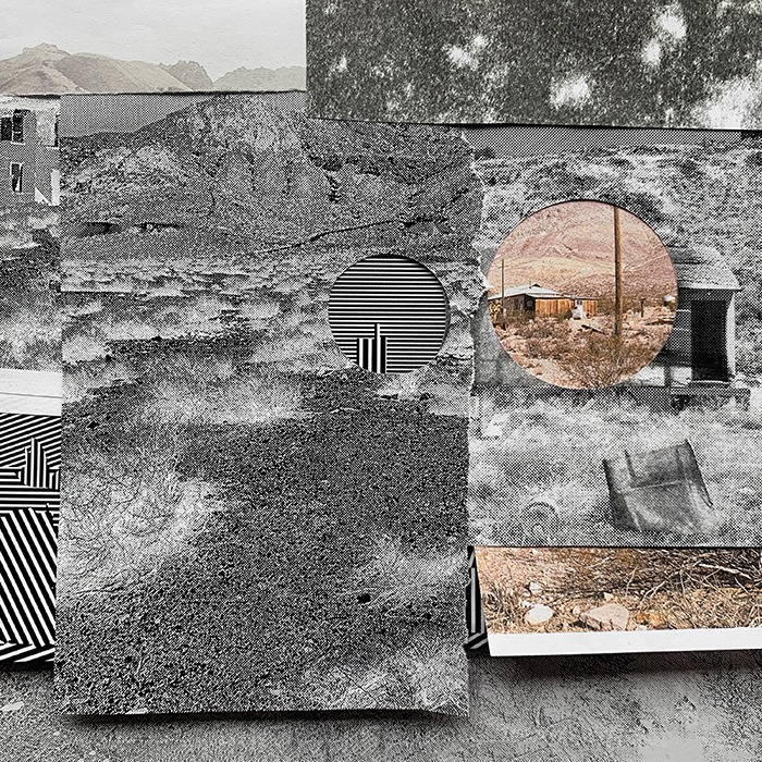 Old Haunts, Lower Reaches is an exhibition of new work by Nick Larsen (b. 1982) that excavates history, possibility, identity, and place. Comprised of layered collage pieces, textile-based architectural models, and image projection, Larsen explores what is present and visible in the desert landscape and, perhaps more importantly, what isn’t.