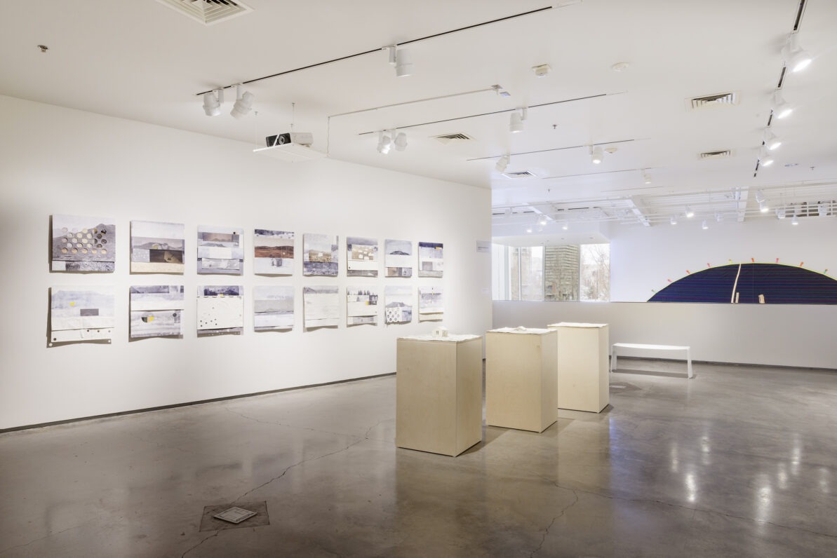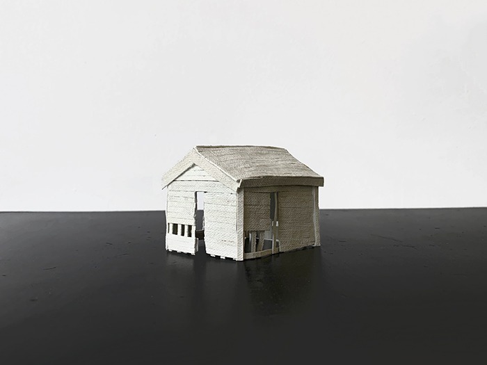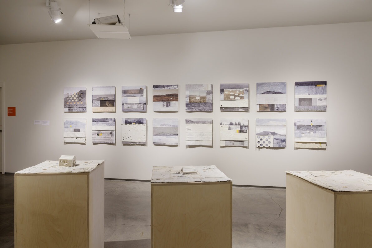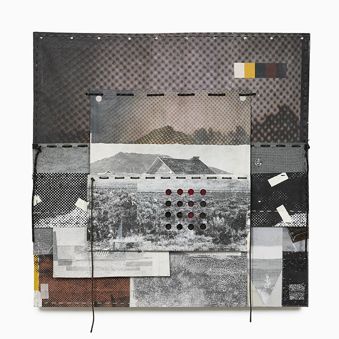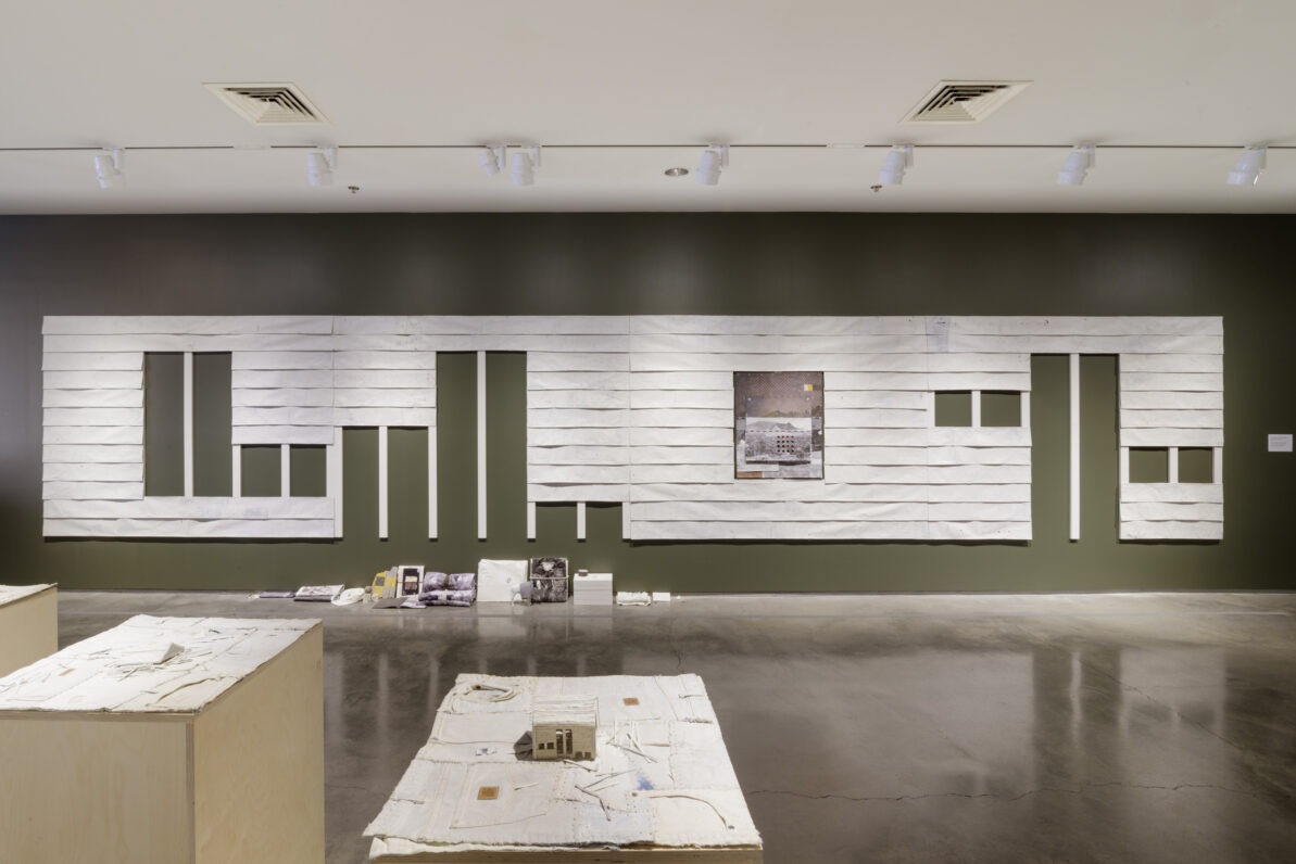 Old Haunts, Lower Reaches is an exhibition of new work by Nick Larsen (b. 1982) that excavates history, possibility, identity, and place. Comprised of layered collage pieces, textile-based architectural models, and image projection, Larsen explores what is present and visible in the desert landscape and, perhaps more importantly, what isn’t.
