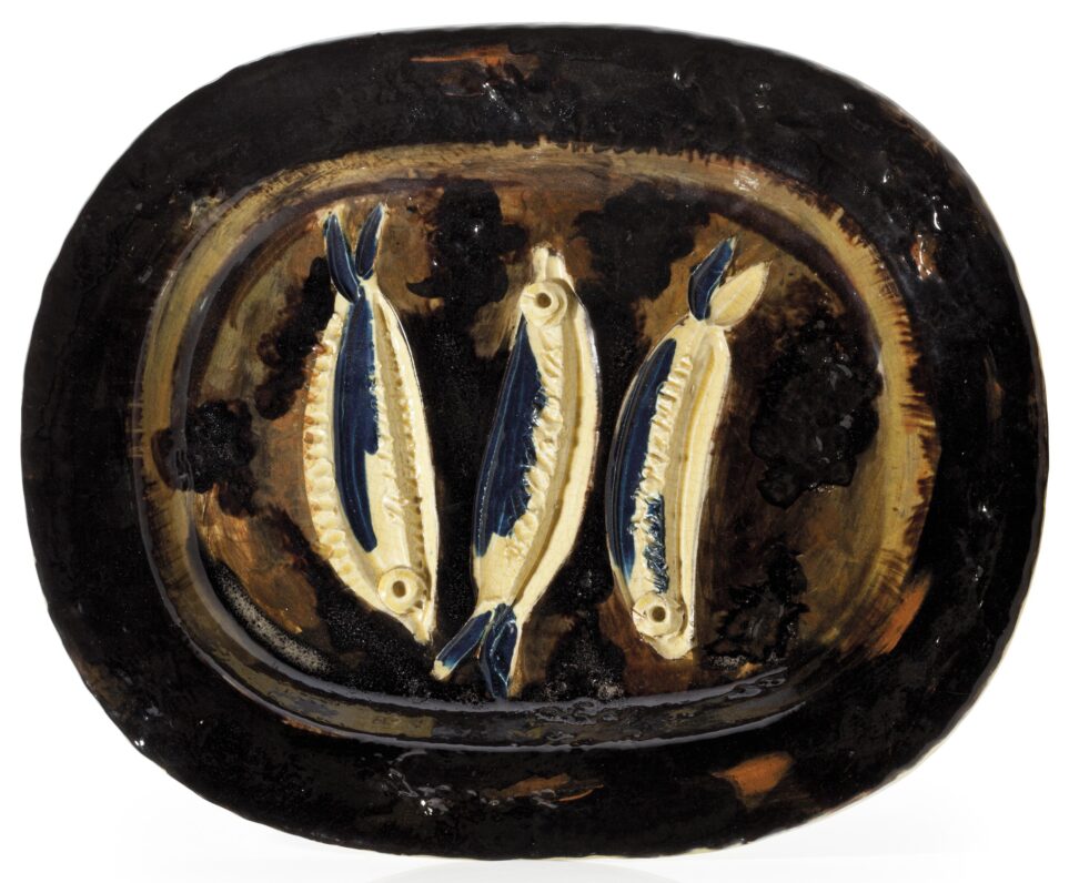 Feature Image: Pablo Picasso, Engraved Bull, 1947, Rectangular dish A.R. white earthenware clay, decoration in engobes, engraved under yellow glaze, 12 1/2 x 15 ½ inches. Collection of the Nevada Museum of Art, Promised gift of Robert Felton and Lindsay Wallis. © 2022 Estate of Pablo Picasso / Artists Rights Society (ARS), New York.