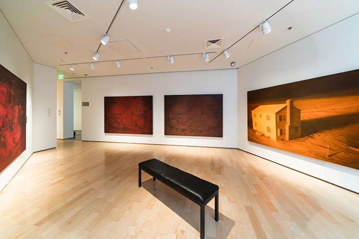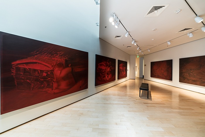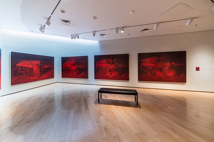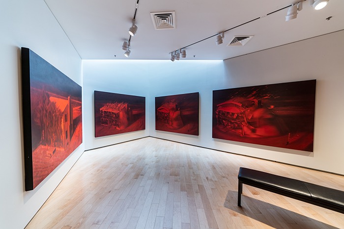 This series of eight, large-scale paintings by Robert Beckmann reveals the potential effects of a nuclear detonation on an American-built, single-family home. The series is based on real-life, Cold War-era testing undertaken on the Nevada Test Site (now the Nevada National Security Site). The deep-red images are based on footage from a 1953 documentary film about the detonation of a 16-kiloton nuclear bomb nicknamed “Annie.” The artist remembers watching the film as a young boy growing up during the Cold War era.