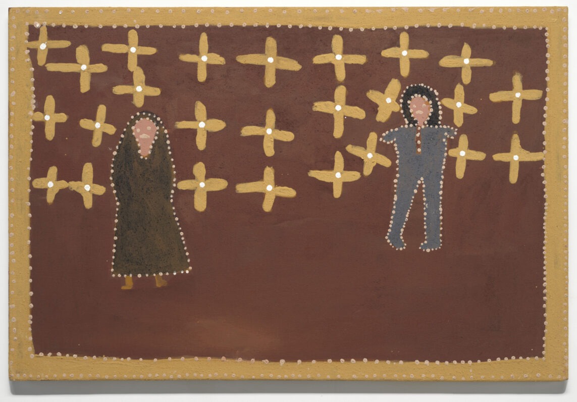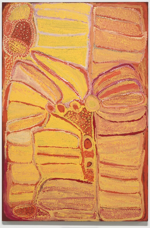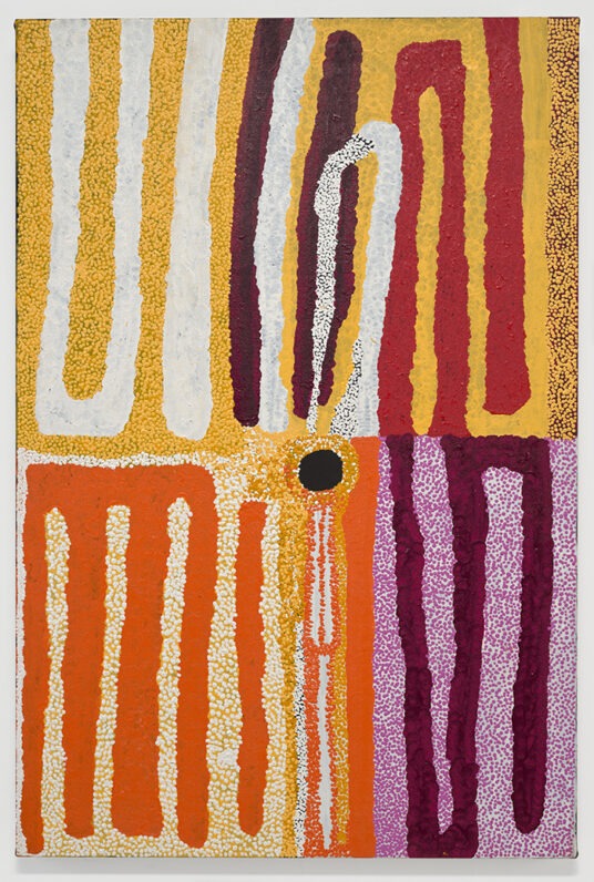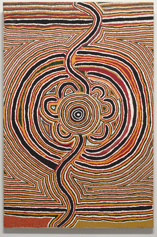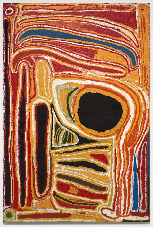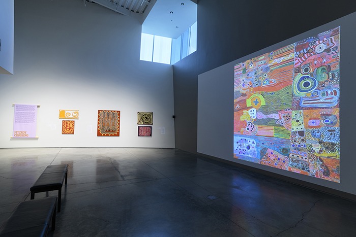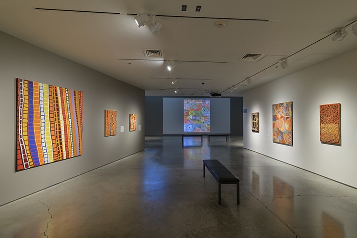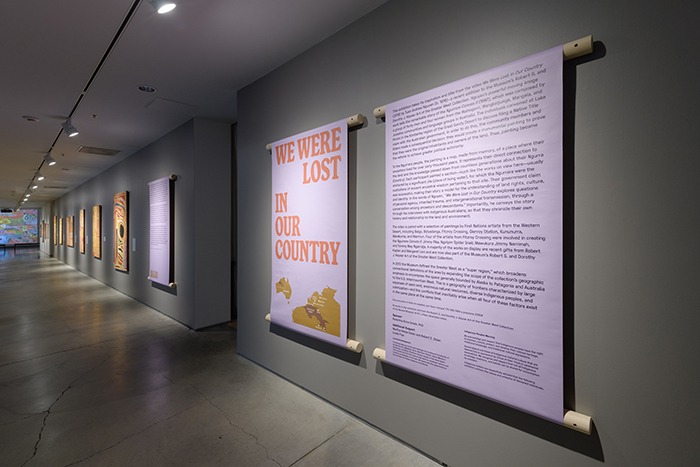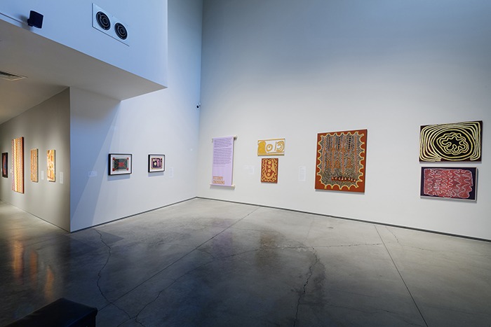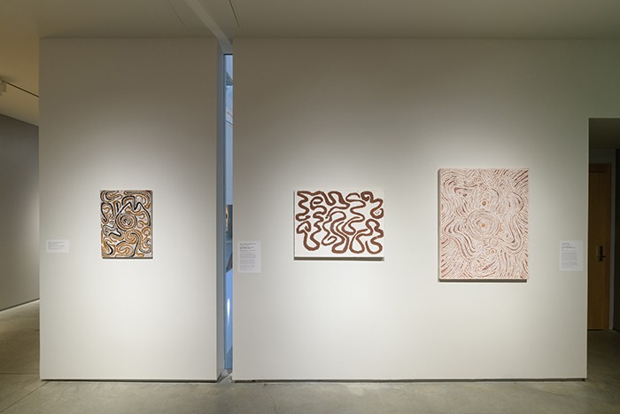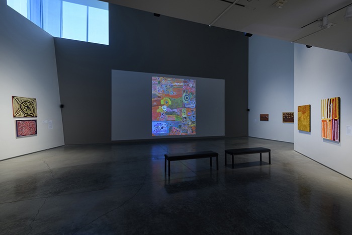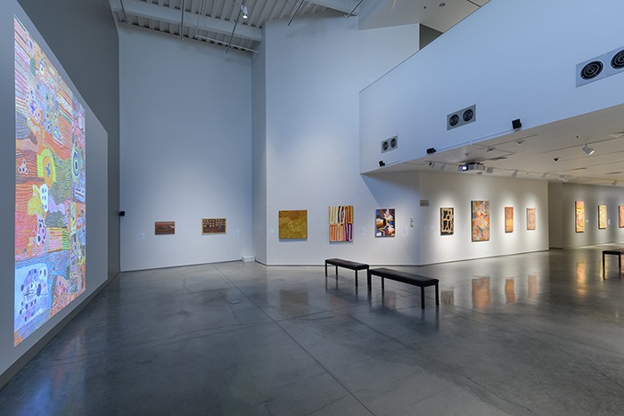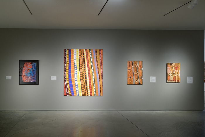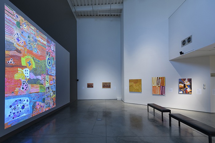 In the exhibition, the video is paired with a selection of paintings by artists from the Great Sandy Desert (also known as the Western Desert), some of whom were involved in painting the Ngurarra Canvas II, such as Jimmy Pike, Ngirlpirr Spider Snell, Mawukura Jimmy Nerrimah, and Tommy May Ngarralja. Most of the works are recent gifts from Margaret Levi and Robert Kaplan, and Dennis and Debra Scholl, and now are part of the Museum’s Robert S. And Dorothy J. Keyser Art of the Greater West Collection. In 2012, the Museum defined the Greater West as a “super region,” which broadens conventional definitions of the West by expanding the scope of the collection’s geographic emphasis to encompass a region generally bounded from Alaska to Patagonia and from Australia to the United States intermountain West. This is a geography of frontiers characterized by large expanses of open land, enormous natural resources, diverse Indigenous peoples, colonization, and the conflicts that inevitably arise when all four of those factors exist in the same place at the same time.
