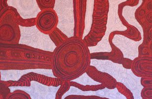 The Indigenous people of Australia are inextricably bound to their land. Although the artists in this exhibition are from diverse communities across Australia, each shares a commitment and responsibility to country. For Aboriginal Australian people, country comprises the land, sea, sky, and everything contained therein. Each artist engages with country in various ways through their work. The artists in this exhibition paint the natural features of their country in a non-representational style that enables the artists to keep secret and sacred elements hidden from uninitiated viewers. They depict songlines, also called Dreaming Tracks, which describe the paths taken by the Ancestors as they created the world during the Dreaming. The Dreaming encodes the location of essential waterholes and food sources into stories, dances, and songs that artists translate into visual form.
