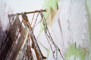 A site-specific installation inspired by the geologic formations of the nearby Black Rock Desert includes a painted form with a jagged line dividing it into two, alluding to the fence under construction which separates the United States and Mexico. Nails and fibers are integrated into the surface, along with paw prints representing the presence of migratory animals. Jimenez Underwood thereby expresses her concern about the environmental impact of the Mexico-United States Barrier. “The border is one land, always has been and always will,” Underwood says. “The plants, animals and flowers know this.”