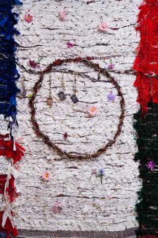 A second series of works consists of a series of five rebozos – the long flat garment worn by women, mostly in Mexico. These weavings are notably more refined and elegant than the border piece. In fact, Underwood intends these works to serve as gifts for her maternal ancestors. “Beauty, grace, and flowers soothe the quiet rage that has permeated the Americas for more than five hundred years. Thus, when I weave, sew, or embellish, the viejitas (the old ones) seem to express their encouragement and support of my creations.”