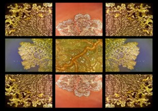 To create Hydraphilia (2009), Wight prepared agar slides tinted with non-toxic dyes, added the slime mold, and began videotaping the resulting growth patterns. The video is a microscopic time-lapsed view (30x) of the Physarum Polycephalum or slime mold. Polycephalum is Latin for “many-headed” and Wight’s title for her video installation references a mythological nine-headed monster, the Hydra of Greek myths that grew two heads when one was lopped off. According to the artist, “This video evokes a love for the beauty and occasional grotesqueness of this many-headed creature.”